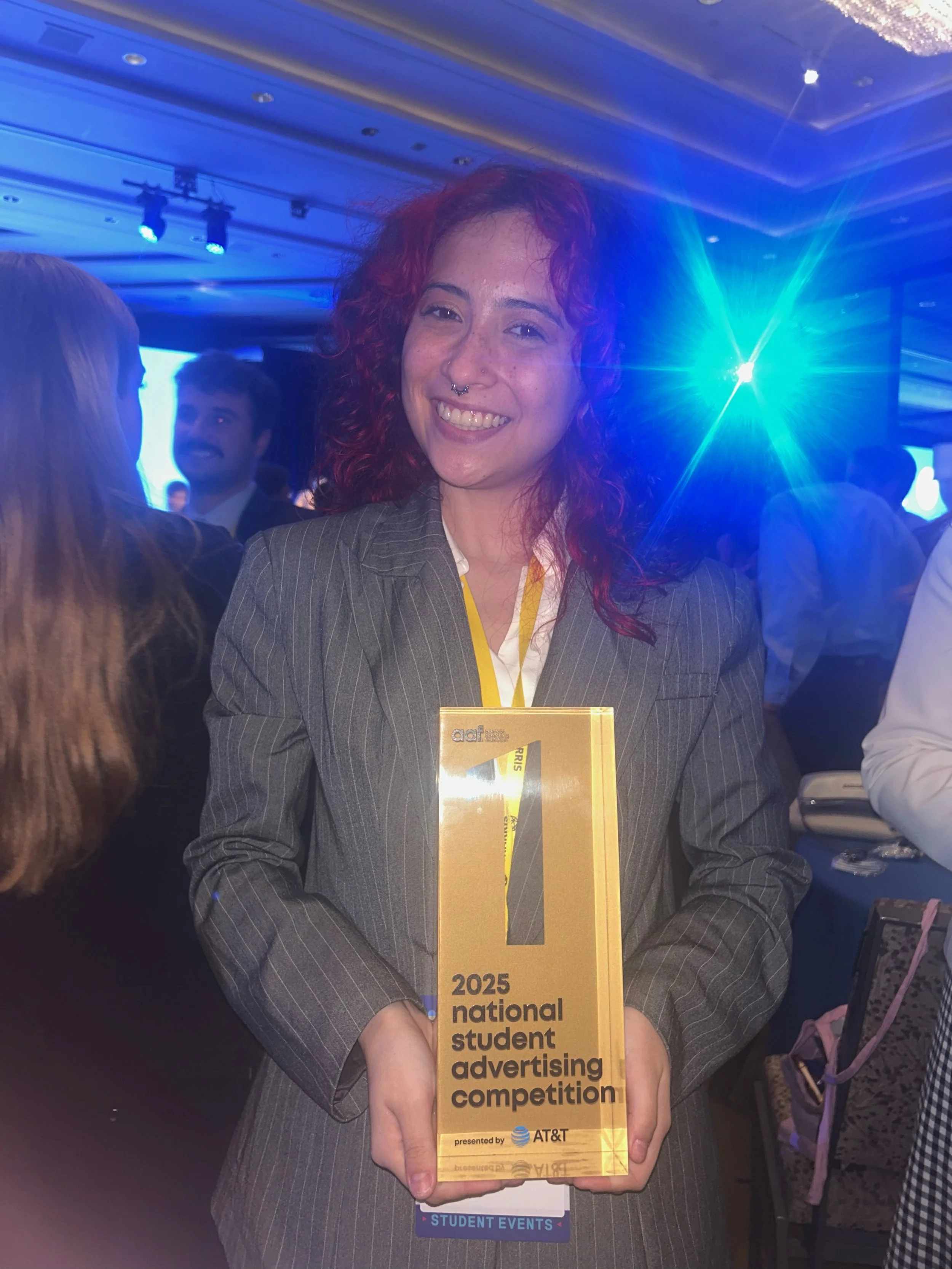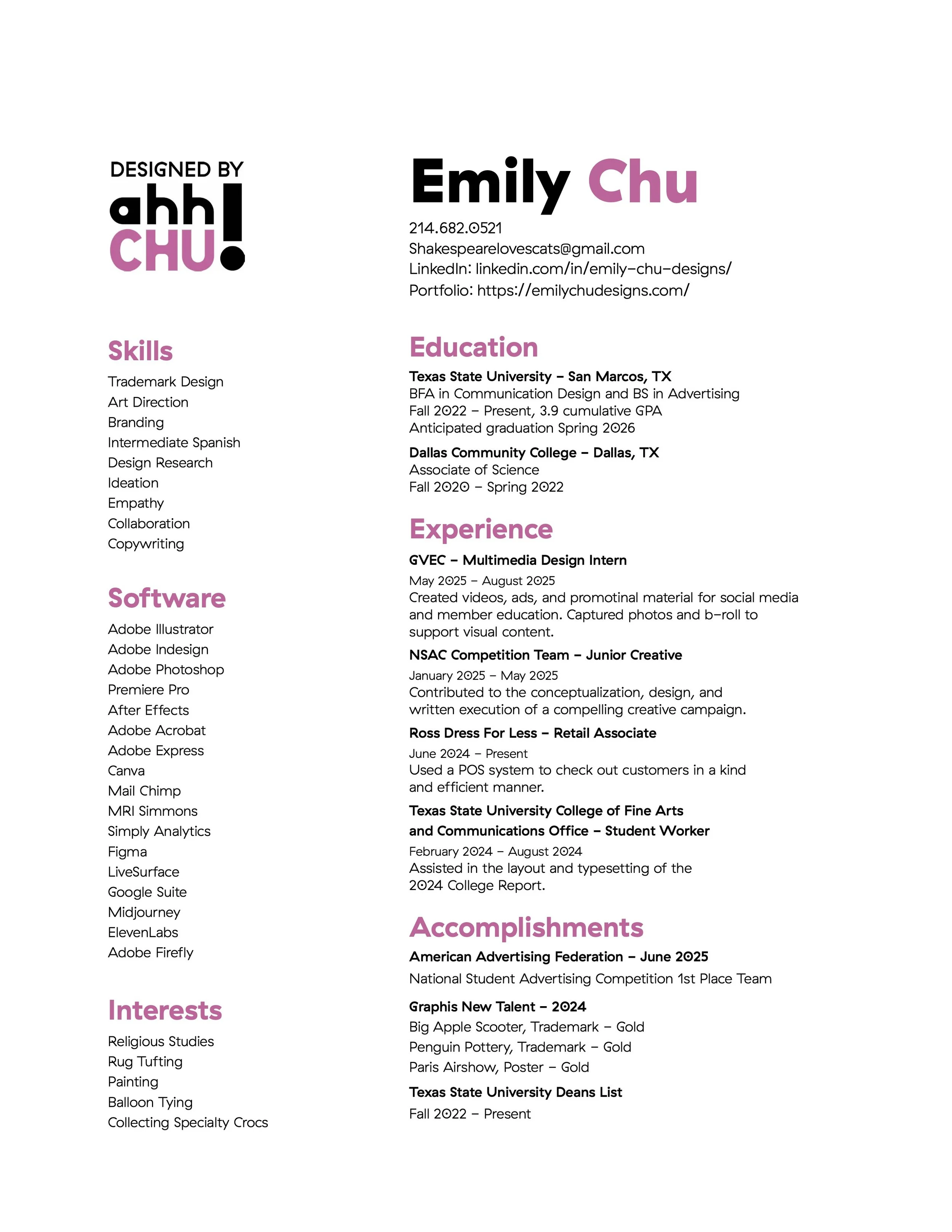 Emily Chu is an outgoing, creative, quirky, and driven designer in her senior year at Texas State University, pursuing a B.F.A. in Communication Design and a B.S. in Advertising. She has received several awards for her designs, including three Graphis New Talent Gold Awards. Emily was also a proud member of the 2025 Texas State National Student Advertising Competition team, which placed first in the nation. When she isn’t designing for class or writing research papers for her Religious Studies minor, she enjoys picking up new hobbies and skills, often referring to herself as a “serial hobby-haver.”